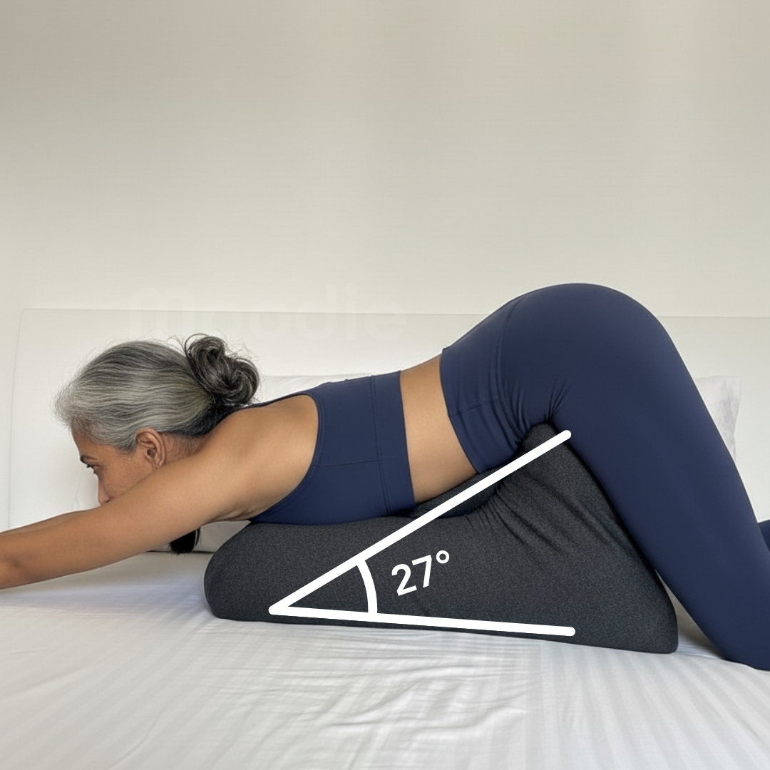 Memory foam locks the 27° angle. Anti-slip base grips any surface. Curved design cradles her body.
