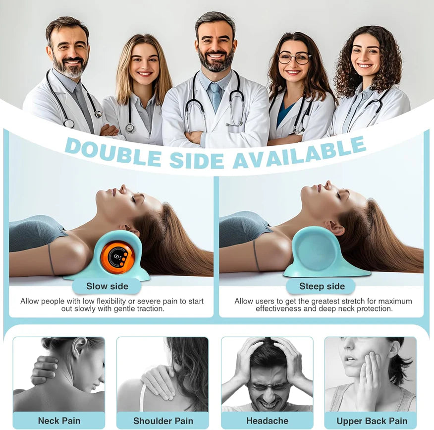 To innowacyjne urządzenie łączy w sobie zalety masażu terapeutycznego, delikatnego rozciągania, stosowania ciepła i EMS (elektrycznej stymulacji mięśni), skutecznie łagodząc ból szyi.